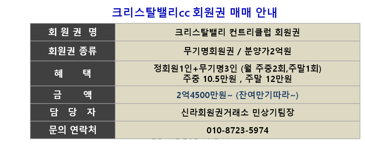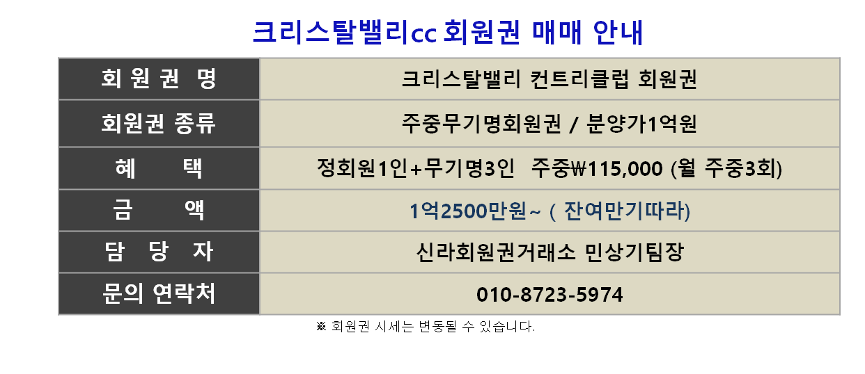 주의사항: 회원권 시세는 시장 상황에 따라 변동될 수 있으므로, 정확한 정보는 신라회원권 거래소나 크리스탈밸리 컨트리클럽에 문의하시는 것이 좋습니다.