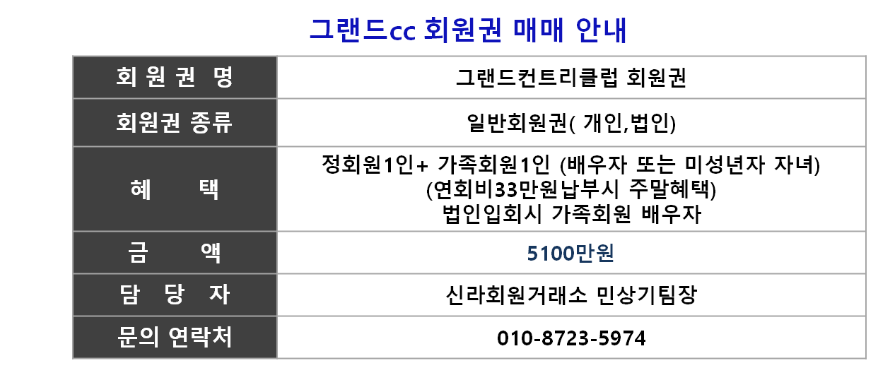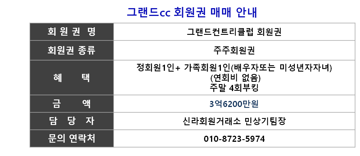 그랜드CC 회원권 매매, 더 이상 고민하지 마세요. 저희 신라회원권거래소 고객님의 성공적인 거래를 위해 항상 최선을 다하고 있습니다. 급매물 정보부터 그랜드CC 회원권 가격 상담까지, 지금 바로 전화 주세요. 친절하고 상세한 상담으로 고객님의 궁금증을 시원하게 해결해 드리겠습니다.